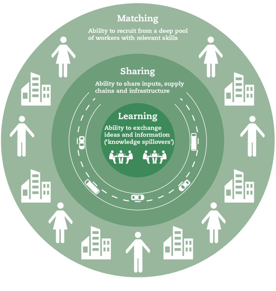 匹配matching(深厚的劳动力蓄水池)、共享sharing(基础设施与供应商)、学习learning(隐性知识的溢出与创新)。