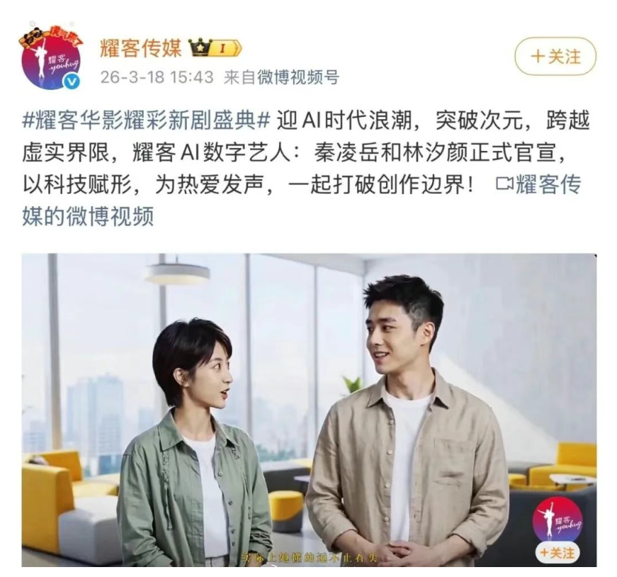 实际上,今年3月,影视行业已经接连投下“AI炸弹”。耀客传媒官宣签约两位AI数字艺人——秦凌岳和林汐颜;聿潇传媒一口气签约6名AI演员,其中包括网红韩安冉和徐志滨;潇湘电影集团也发布了两大3D全息数字人“肖阳阳”和“李燃燃”。