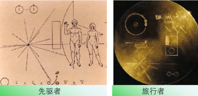 大家可以看到这两张图。这是第一种方式:派宇宙飞船去寻找外星人。20世纪70年代,先驱者探测器、旅行者探测器,它们都从地球上发射之后,奔着太阳系的边缘飞去,直到现在一直在飞。它们携带了一些信息,比如说携带了太阳系的一些图案,还携带了一些音频和视频的信息来表征我们地球人类文明的先进程度。这种方式是非常昂贵的,相当于大海里面的漂流瓶,也不抱什么希望,就是让它一直往外飞。