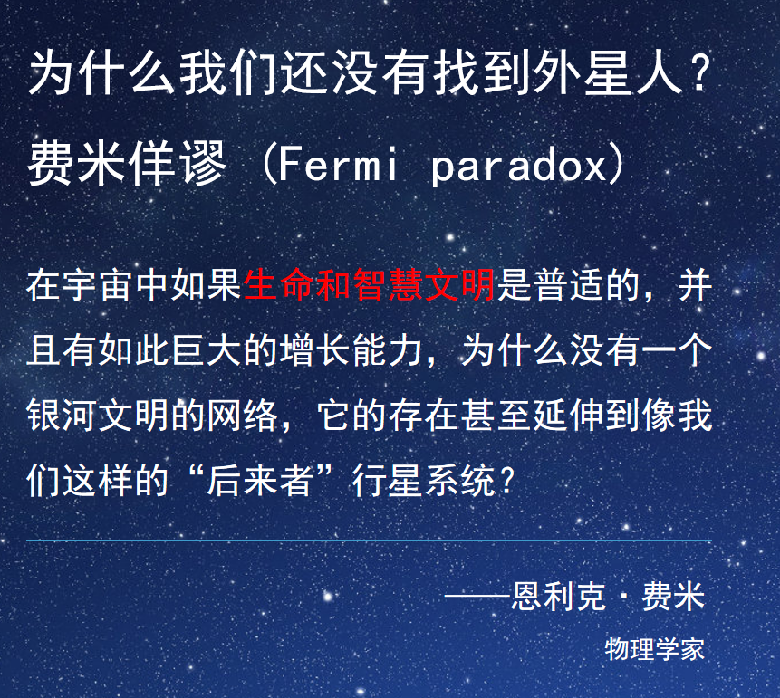 如果外星人存在的话,那么在我们银河系里面就应该有一代一代的外星人。一代外星人消亡了,另一代外星人出现,然后一直到今天。但是我们并没有看到任何外星人。所以说,这就是费米悖论。