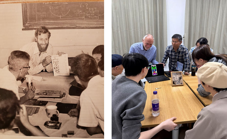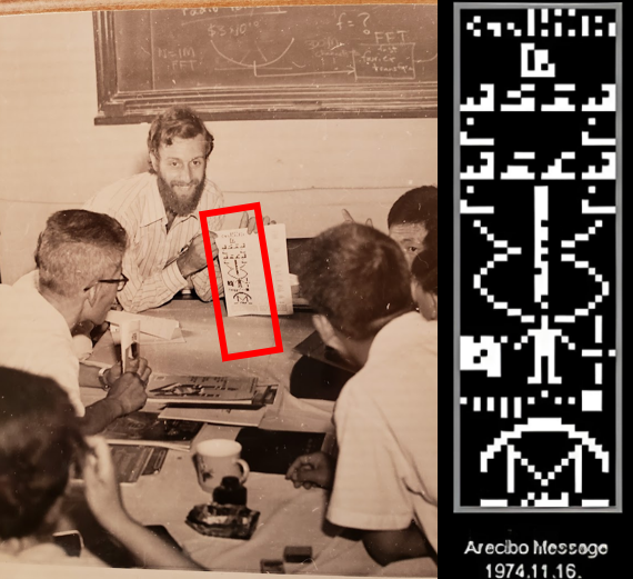 我们聊得非常深入,后来我才知道他在20世纪70年代的时候,还曾经在我们北师大工作过一年。这张照片就是他当时在北师大工作的时候,向北师大的计算机专家、天文学家,讲述阿雷西博望远镜向球状星团发射信息的照片。