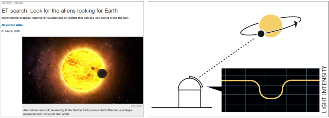 那么,另外一些目标就是寻找能够看到地球的外星人所居住的系外行星。他们怎么来看我们地球,就相当于我们怎么看他们一样。有一种现象叫“凌日”,比如说外星人用望远镜看我们的地球,掠过太阳的时候,太阳可以进行消光,它的光度就会变弱,所以这种现象叫凌日现象。