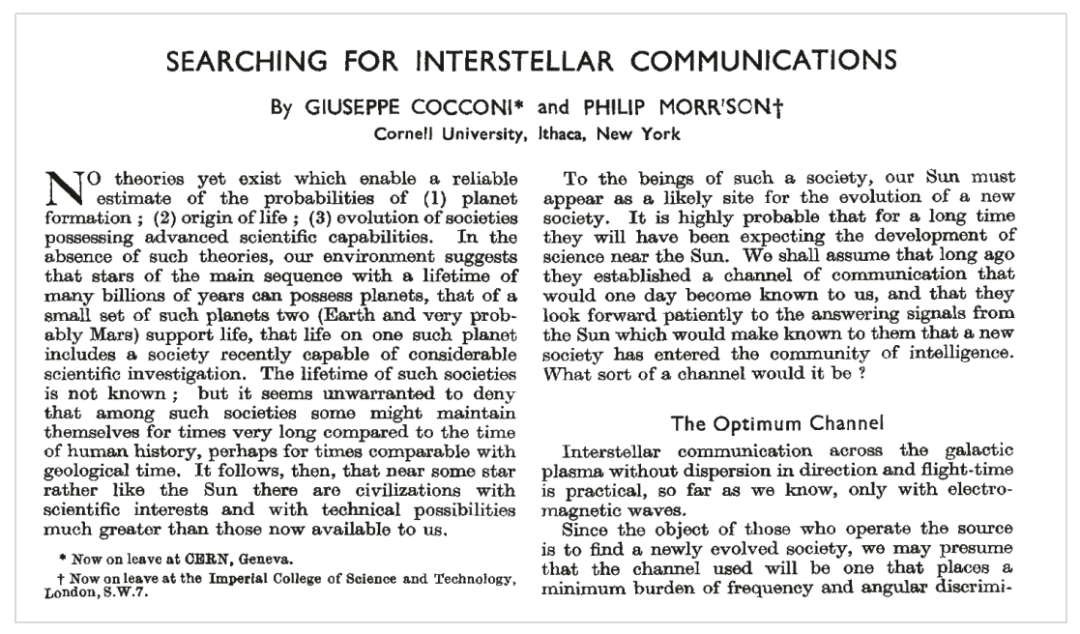 这是康奈尔大学一个天文学家,在1959年nature上发表的一篇文章。这篇文章可以说是SETI研究最具开创性的一篇文章,也是第一篇科学上研究SETI的文章。之后60年,德雷克就开始了他的观测研究。所以说,地外文明的搜寻,从20世纪60年代到今天,已经过去60年了。