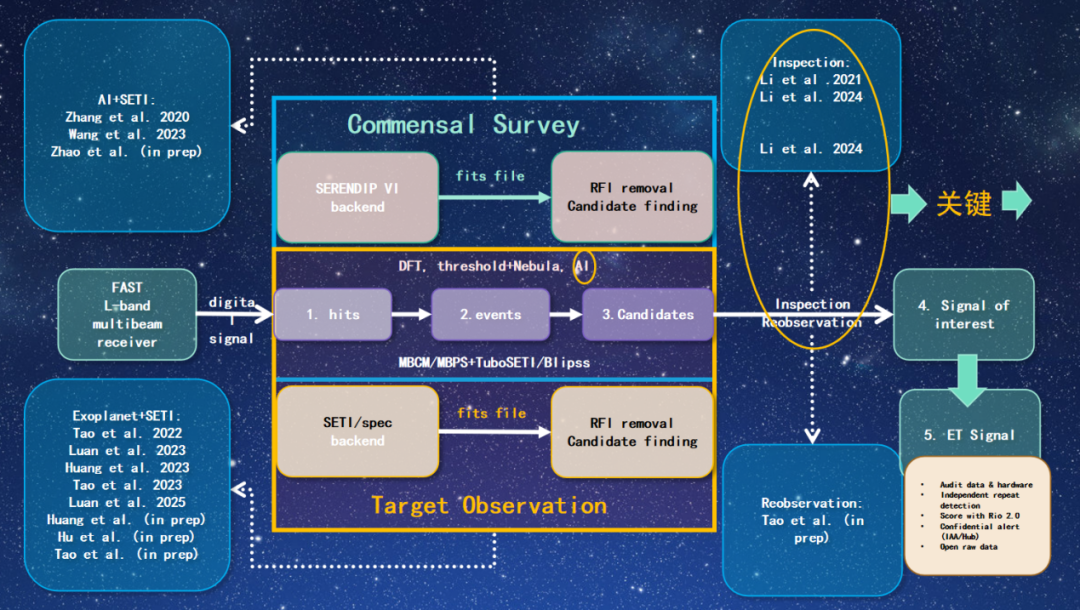 这种搜寻方式叫多波束联合匹配策略,我们可以筛掉一些不符合条件的,于是它们就成为第二级别叫事件。到了这时候,其实还有很多信号,它还不是候选信号。这个时候我们就把AI用在了这里面,用AI搜寻筛除了那些射电干扰——包括地球上发射的一些干扰,还有天体的一些信号。我们用人工智能把它筛选掉,就成候选信号了。