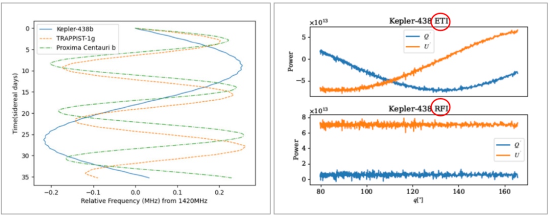 第一种方式是频率漂移判据。我们发现了这个候选信号之后,就在系外行星绕着它的母星一个周期内连续观测,看看它的频率漂移是否符合这样一个理论曲线。