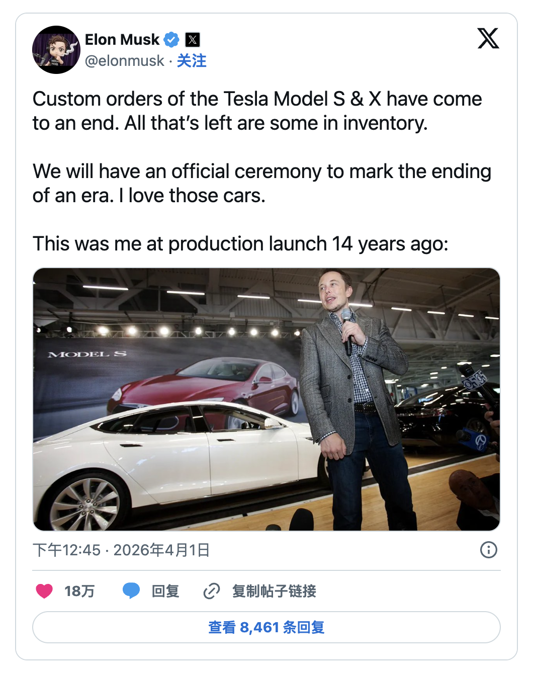 当地时间2026年4月1日12点45分,特斯拉首席执行官埃隆·马斯克(Elon Musk)通过社交媒体X正式宣布了这一消息。
