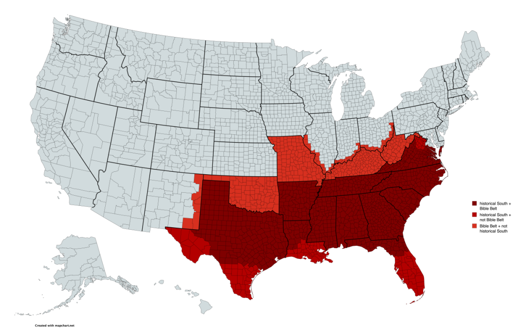 “圣经地带”是指新教福音派信仰比较强,宗教文化相对浓厚,整体上通常比较保守的美国一些地区。它其实并没有一个完全固定的州界,通常指美国南部和邻近地区的福音派基督教文化带。常见包括阿拉巴马州、阿肯色州、佐治亚州、肯塔基州、路易斯安那州、密西西比州、密苏里州、北卡罗来纳州、南卡罗来纳州、田纳西州、弗吉尼亚州、德克萨州,另外也会把俄克拉荷马州、堪萨斯州南部以及西维吉尼亚州的一部分算进去。