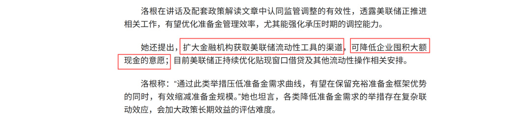 显而易见,沃什、米兰以及大多数投资者的方案是缩减银行资产负债表规模,这对金融体系有强烈地紧缩效应(ps:这类方案属于“准备金稀缺框架”);然而,洛根钻了个空子,她说我们可以提高银行准备金的使用效率啊,虽然准备金率降低到零了,但是其他监管因子依旧在制造摩擦。