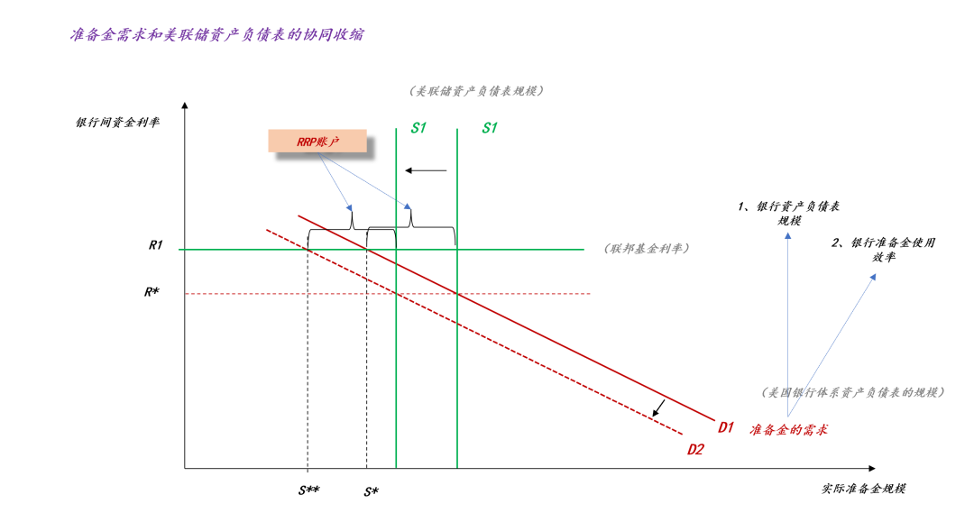 于是,方案就变成了,协调收缩准备金的供需两端:1、让准备金的需求曲线从D1缩减到D2;2、美联储资产负债表的规模从S1缩减到S2。然而,真正的关键点在于如何缩减准备金的需求上,如上图所示,准备金的需求有两个因子,1、银行资产负债表规模;2、银行准备金使用效率。