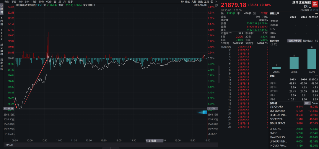 2026年4月2日的美股比较奇怪,纳斯达克指数先是因为“特朗普公开讲话不及预期”而大幅低开低走,之后纳指因为某个因素X快速拉升,最终,纳指收涨0.18%。
