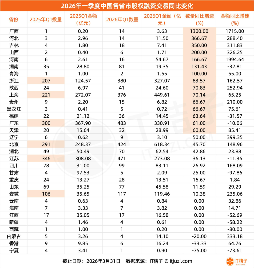 本文来自微信公众号: IT桔子 ,作者:Judy,原文标题:《全国各省市创投增长图鉴:广西1300%增速 vs 浙江83%增速,谁更真实?》