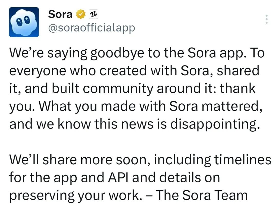 Sora的关停还暴露了一个更深层的问题:建立在单一封闭模型API上的应用极其脆弱。Sora说关就关,所有基于它开发的工具一夜价值归零。依赖单一模型,就是在沙滩上盖房子。