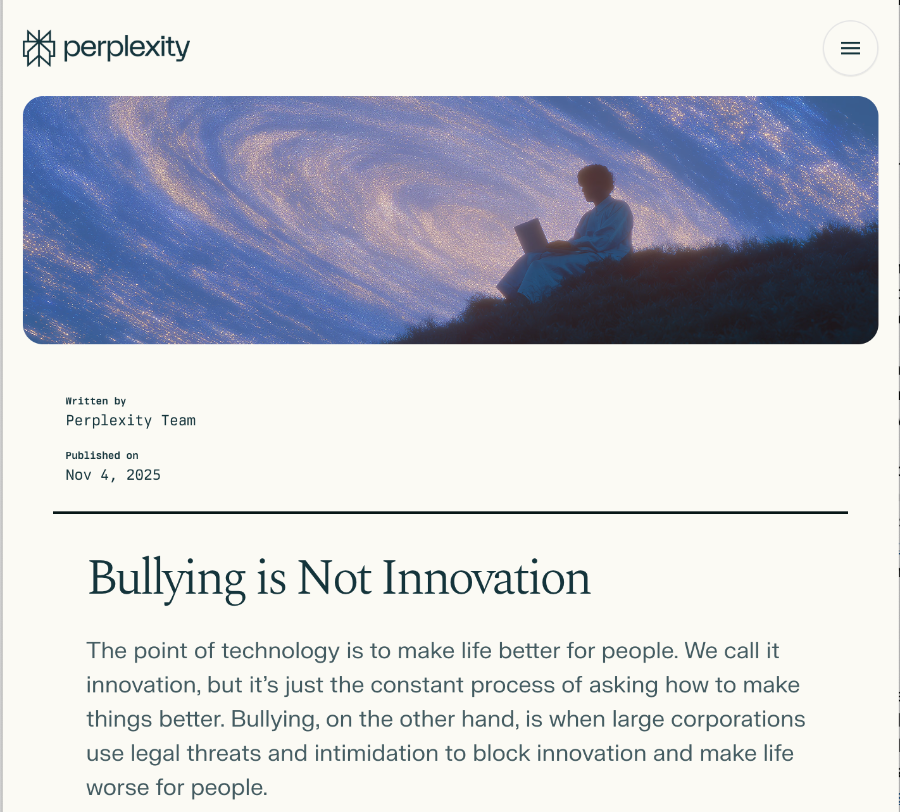 Perplexity在博客更新《霸凌不是创新》,称亚马逊为“霸凌者”