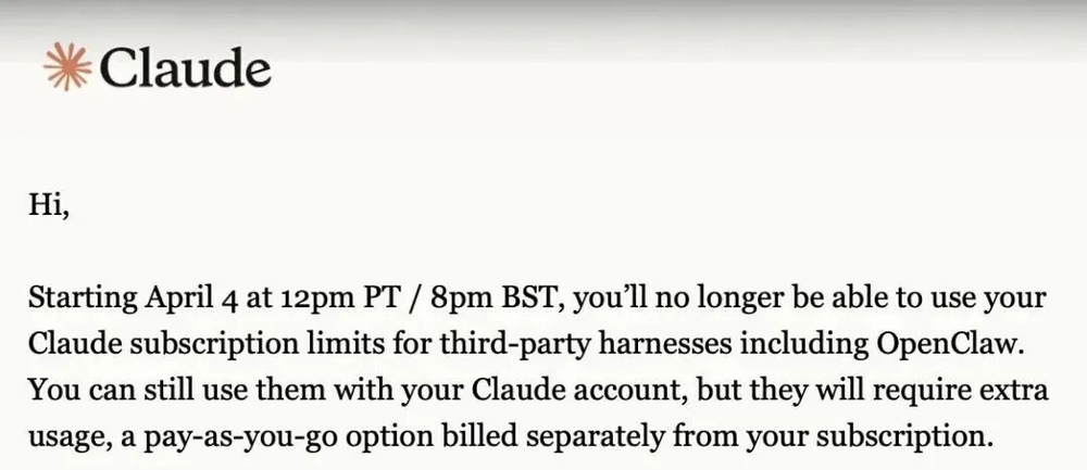 用户已经陆续收到官方邮件:从即日起,Claude的订阅费用只能用于官方自己的网页端、App,以及官方认可的开发工具。第三方平台,比如OpenClaw,不在范围内。
