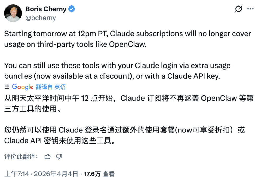 Boris Cherny表示:如果你想继续通过第三方工具使用Claude,就走API通道,按token付费。没有包月,没有折扣,没有例外。