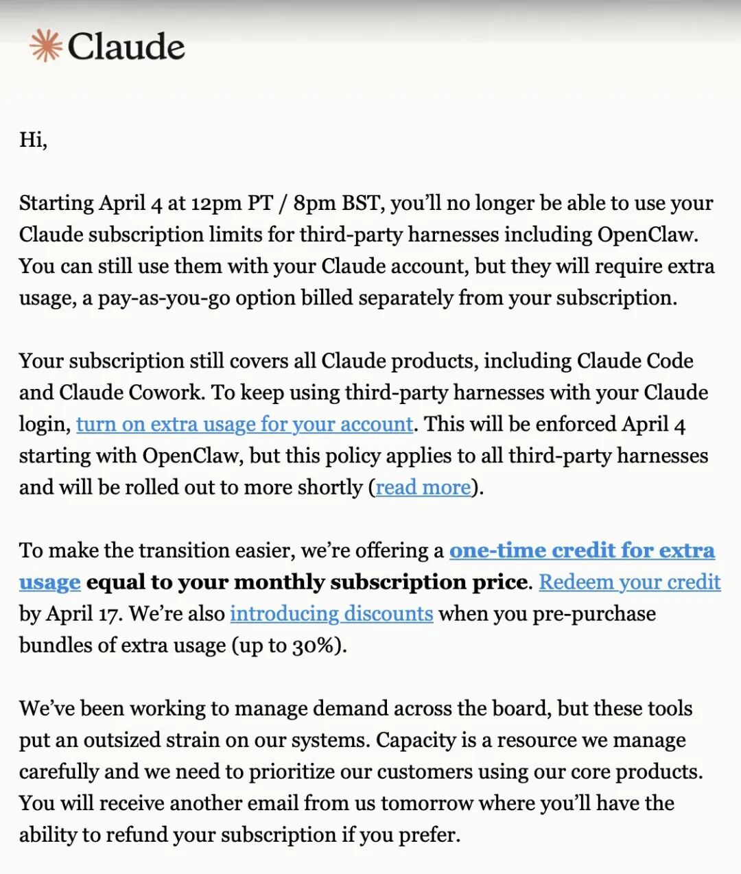 我们一直在努力整体管理使用需求,但这些工具给我们的系统带来了明显更大的压力。系统容量是我们需要谨慎管理的资源,因此我们必须优先保障使用核心产品的客户。明天你还会再收到我们的一封邮件,届时如果你愿意,可以选择退款你的订阅。