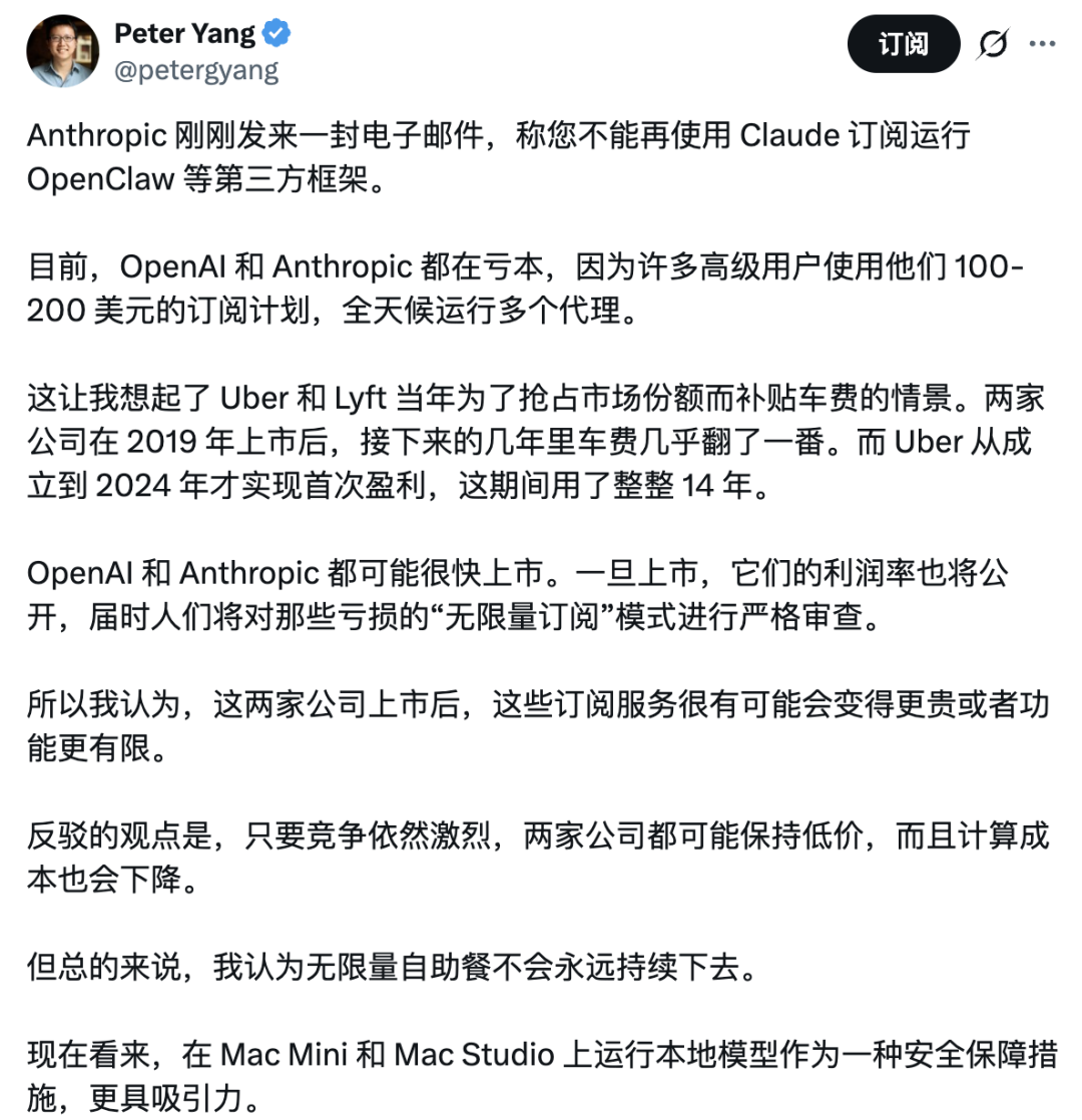 他的判断是,OpenAI和Anthropic上市都不远了,财务数据一公开,这些亏本订阅计划必然撑不住,要么涨价要么限流,顺带还补了一刀:“Mac Mini和Mac Studio跑本地模型,现在看起来越来越香了。”