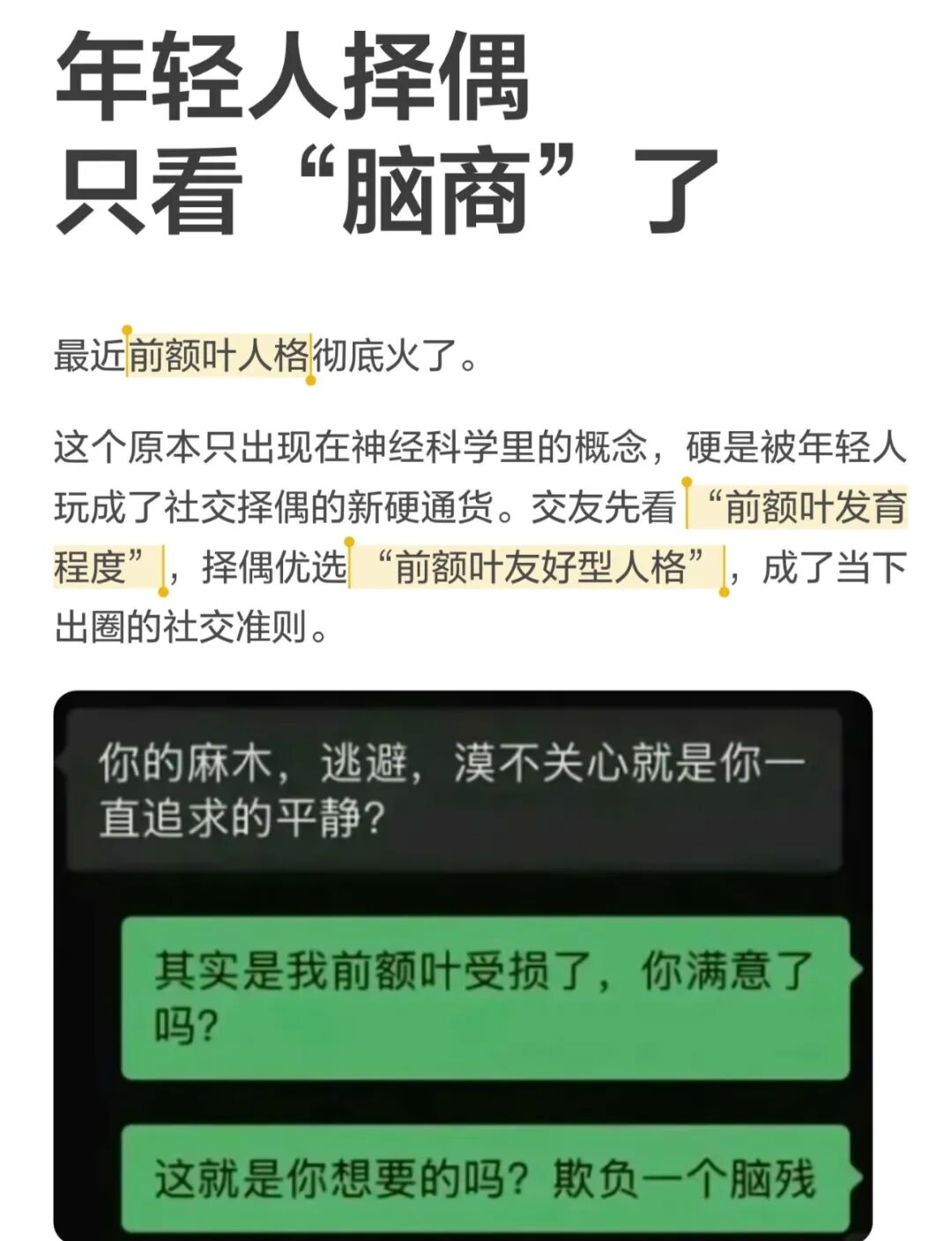 “25岁之前人在生物学意义上都是脑残”“建议把前额叶纳入择偶标准”,直接让这个概念出了圈。