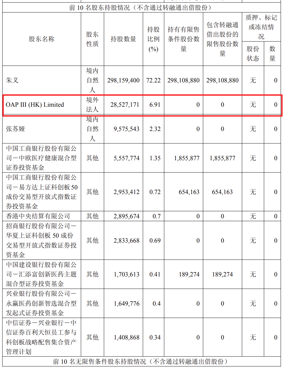 近日,百利天恒(688506.SH)披露,公司第二大股东,也是其前10名股东中唯一的外资股东OAP III(HK)Limited(简称奥博资本)已完成减持。2026年2月9日至3月30日,奥博资本通过竞价交易方式减持412.87万股,占总股本的1.00%,套现约合11.26亿元。