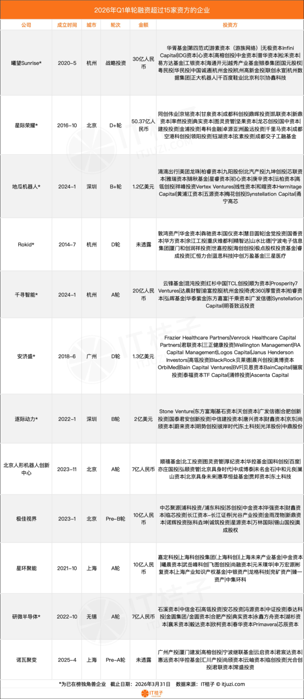 从投资方数量维度观察,一季度“最受欢迎公司”的门槛被抬高至15家以上投资方。杭州曦望Sunrise以27家投资方的阵容领跑,这家成立于2020年的AI基础层公司在战略投资轮即斩获30亿元人民币融资,成为当季单轮投资方最多的公司。紧随其后的是商业航天领域的星际荣耀(24家投资方,50.37亿人民币D+轮)和机器人赛道的地瓜机器人(22家投资方,1.2亿美元B+轮)。