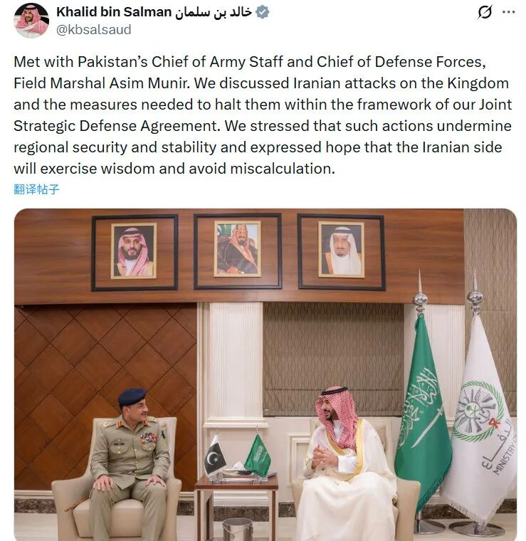 3月7日,沙特国防大臣哈立德·本·萨勒曼通过社交媒体X发布声明,称其与巴基斯坦陆军元帅、陆军参谋长穆尼尔举行会晤,就伊朗针对美以打击发起的报复性行动及沙特因此面临的安全危机进行磋商。双方还商定了在两国“联合战略防御协定”框架内,制定制止此类袭击的具体措施。