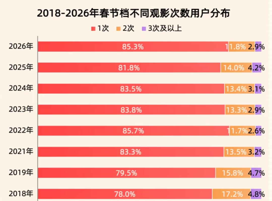 例如全年有过半的观众一年只去一次电影院,而这次机会往往发生在春节档。根据2026年春节档数据报告来看,春节档里超85.3%的观众只有一次观影行为,这个比例是在上升的。