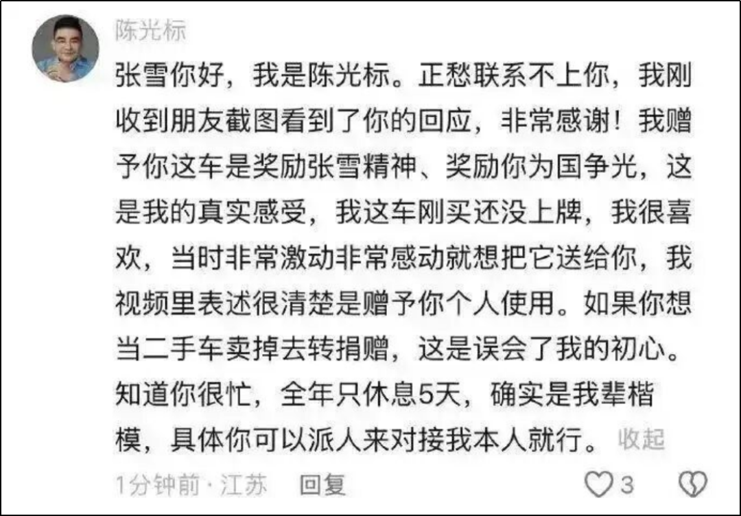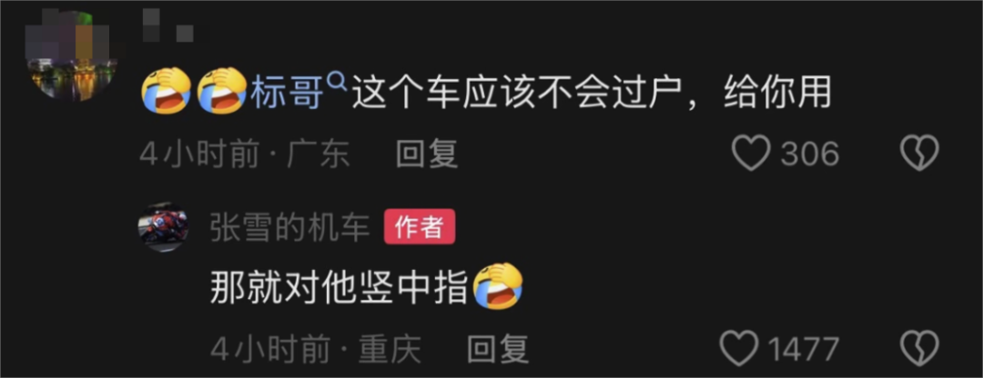 网友还觉得这车不会过户,张雪最多只有使用权,张雪就说那给他竖中指。