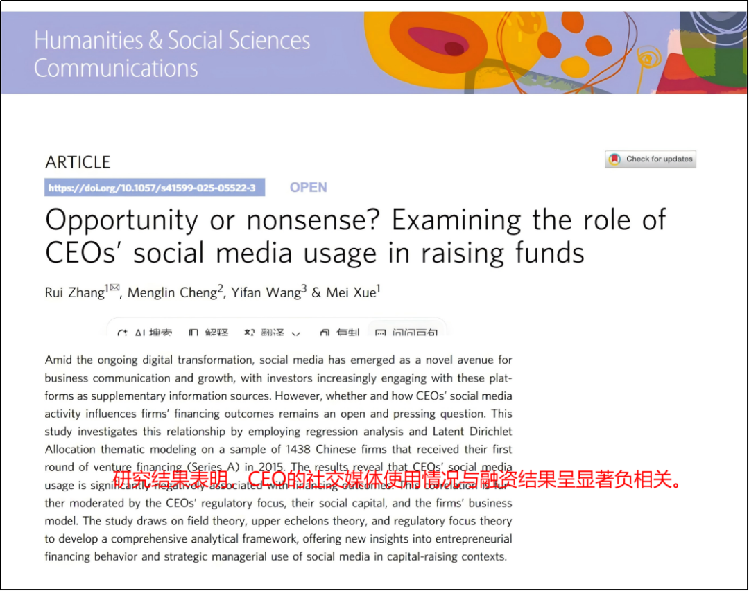 Nature子刊发表过一篇研究,这论文用1438家中国A轮创业公司的数据做过统计,结论是:CEO在微博越爱发帖,公司越难拿到下一轮融资。