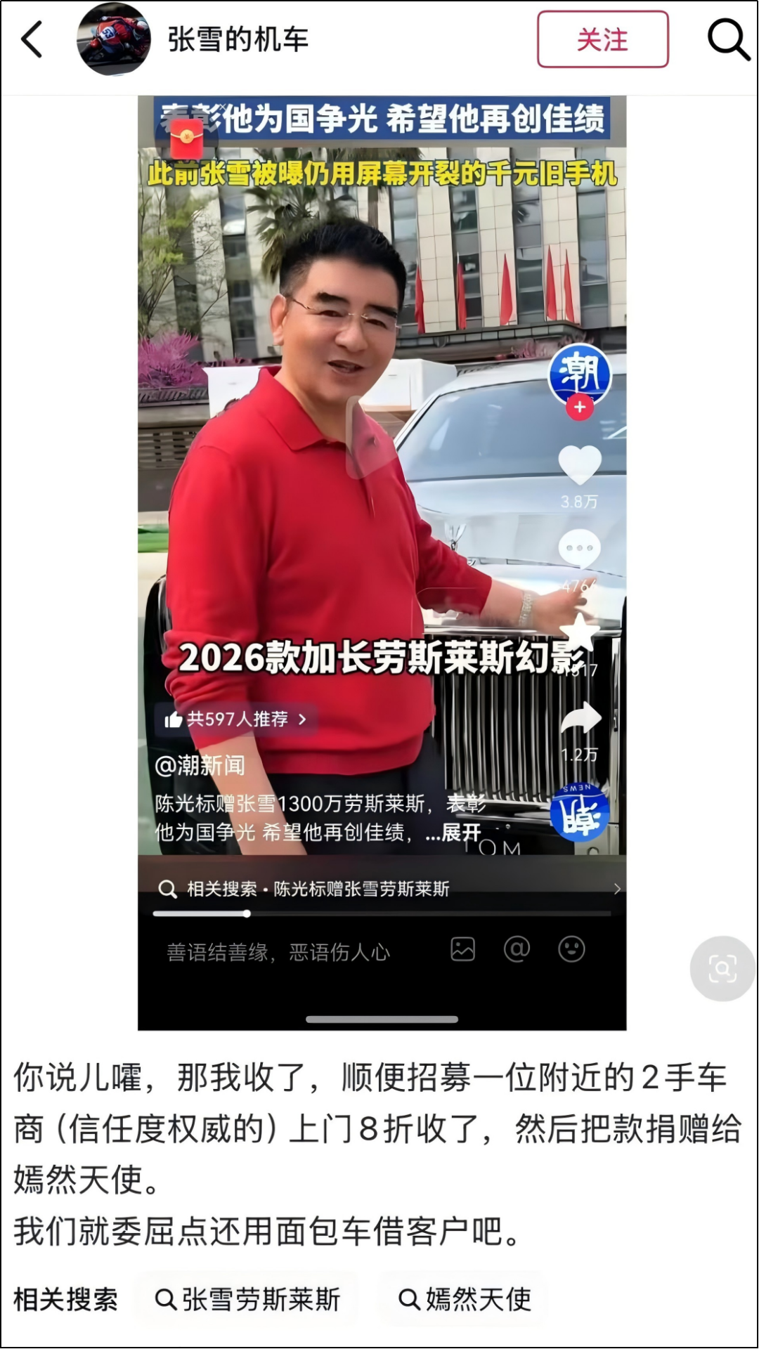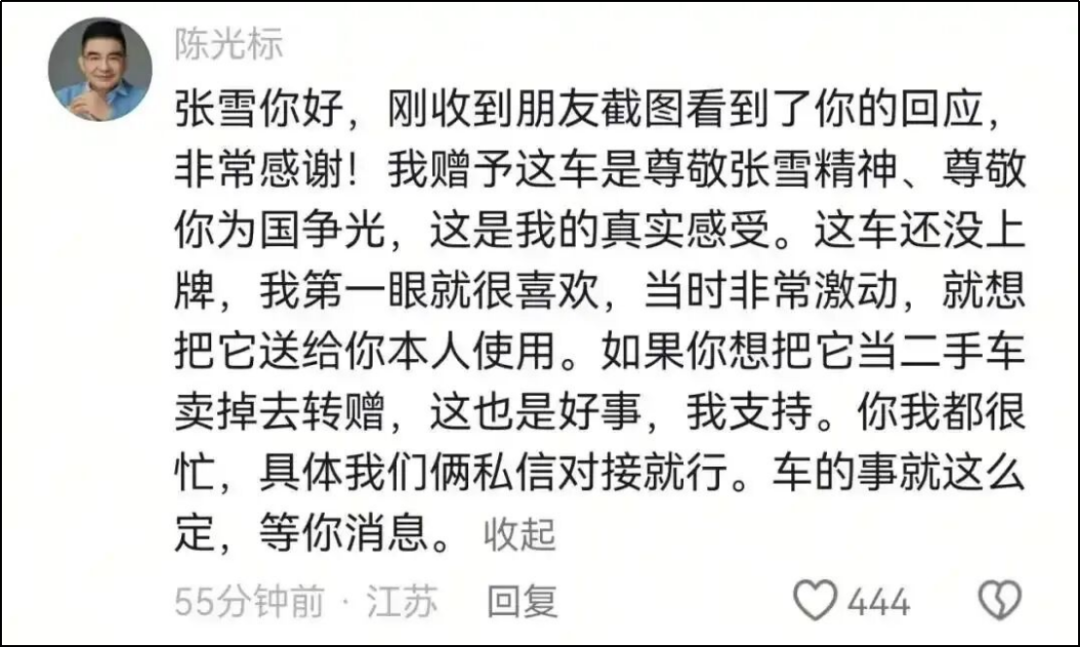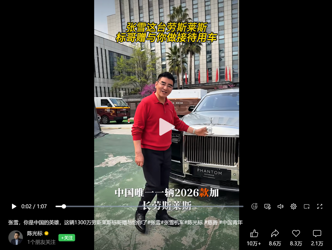 因为要感谢张雪机车为国争光,陈光标打算送他1300万的劳斯莱斯。
