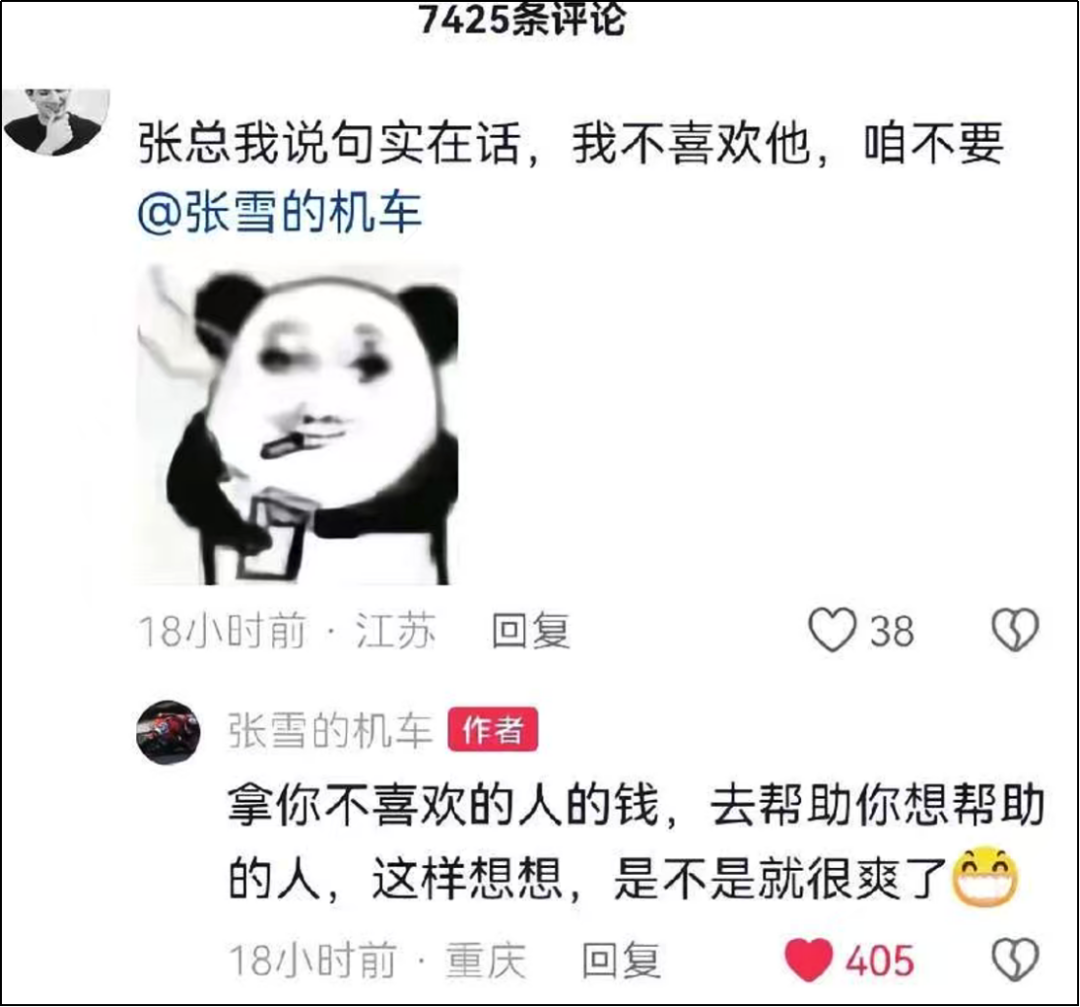 网友说不喜欢标哥,张雪说拿不喜欢的人的钱,去帮助你想帮助的人,是不是很爽。