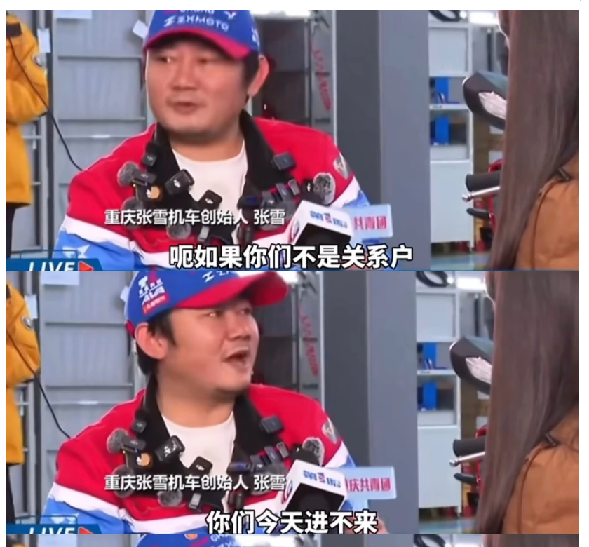 张雪又以说真的说假的起调,再放狠话:“如果你们不是关系户,你们今天进不来,我都不想接这个采访。”