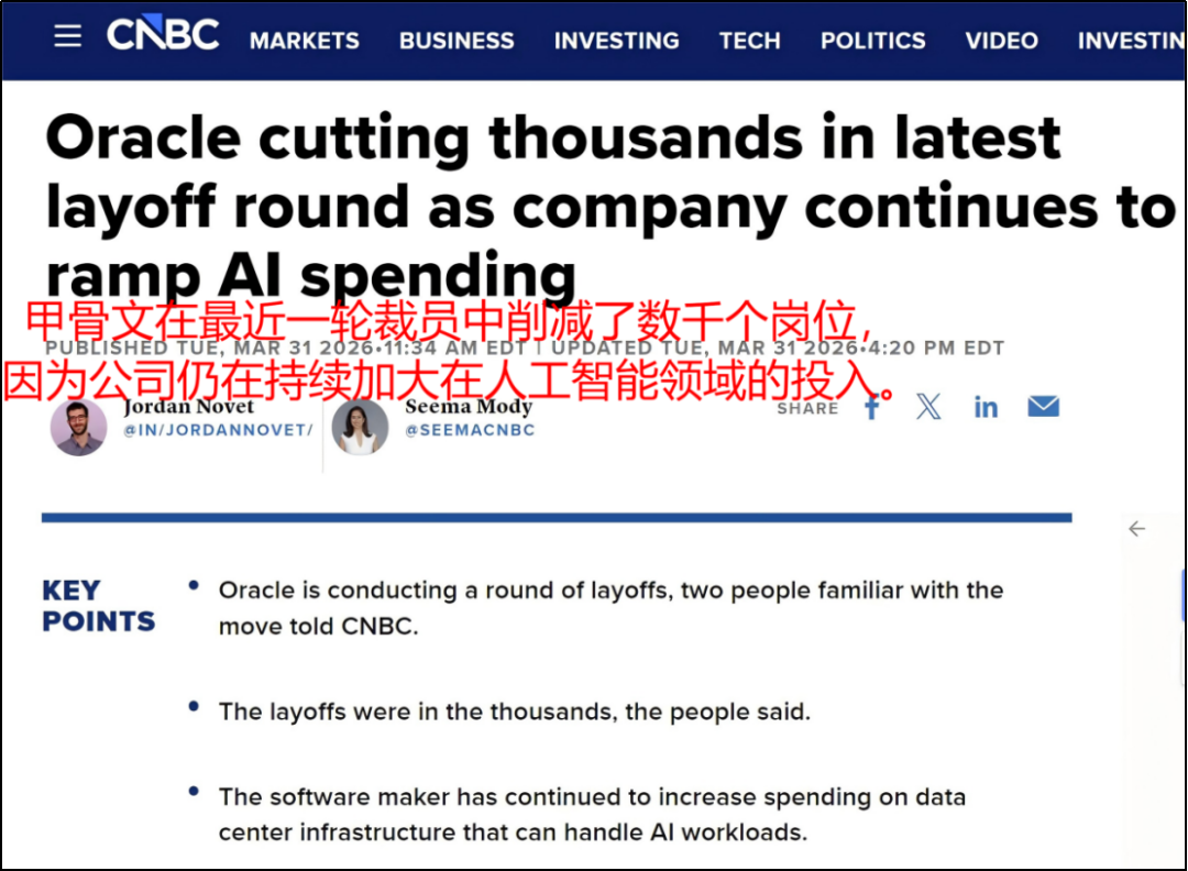 简单说是为了砸重金搞AI基建。因为建数据中心、扩云基础设施,这些都非常烧钱,也让甲骨文欠了很多钱。而裁员省下的钱,正好能抵一部分AI资金压力。