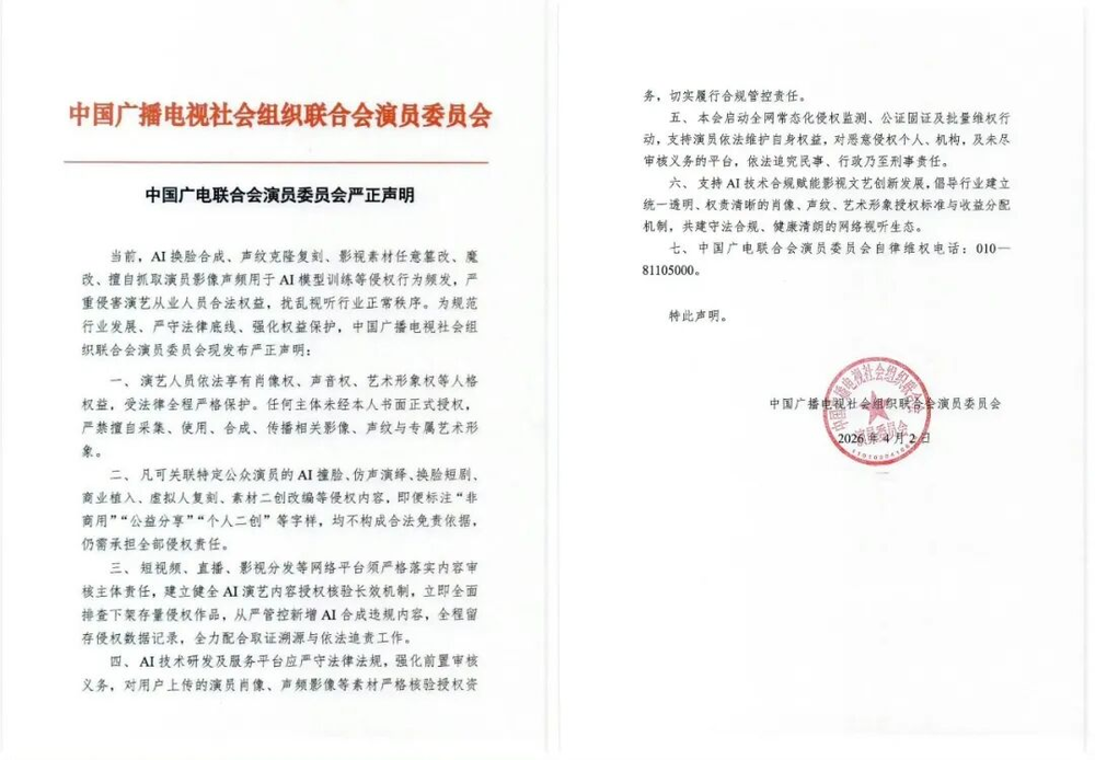 令人欣慰的是,在乱象频发的背景下,监管和平台的行动节奏正在加快。日前,中国广播电视社会组织联合会演员委员会发布严正声明,指出“AI换脸合成、声纹克隆复刻、影视素材任意篡改、魔改、擅自抓取演员影像声频用于AI模型训练等侵权行为频发”,表示将启动全网常态化侵权监测,为规范行业发展强化权益保护。