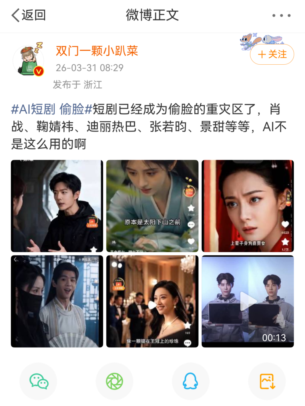 日前,AI短剧《桃花簪》被指侵犯肖像权。汉服妆造师“白菜汉服妆造”发现,剧中一个贪财好色反派的身形、样貌、绿色汉服和妆容配饰,几乎与他发布在小红书上的原创照片一模一样。无独有偶,同一天,商业模特“七海Christ”也控诉该剧盗用她的照片,用于塑造一个虐女虐待动物的丑角,严重丑化了她的形象。