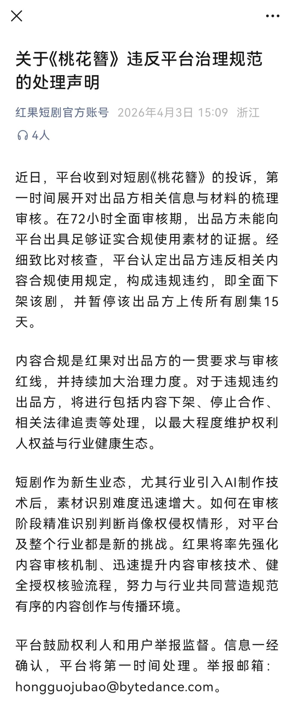事件发酵后,红果平台迅速介入:经72小时审核,出品方未能出具合规使用素材的证据,平台认定其违规,随即全面下架该剧,并暂停该出品方上传所有剧集15天。