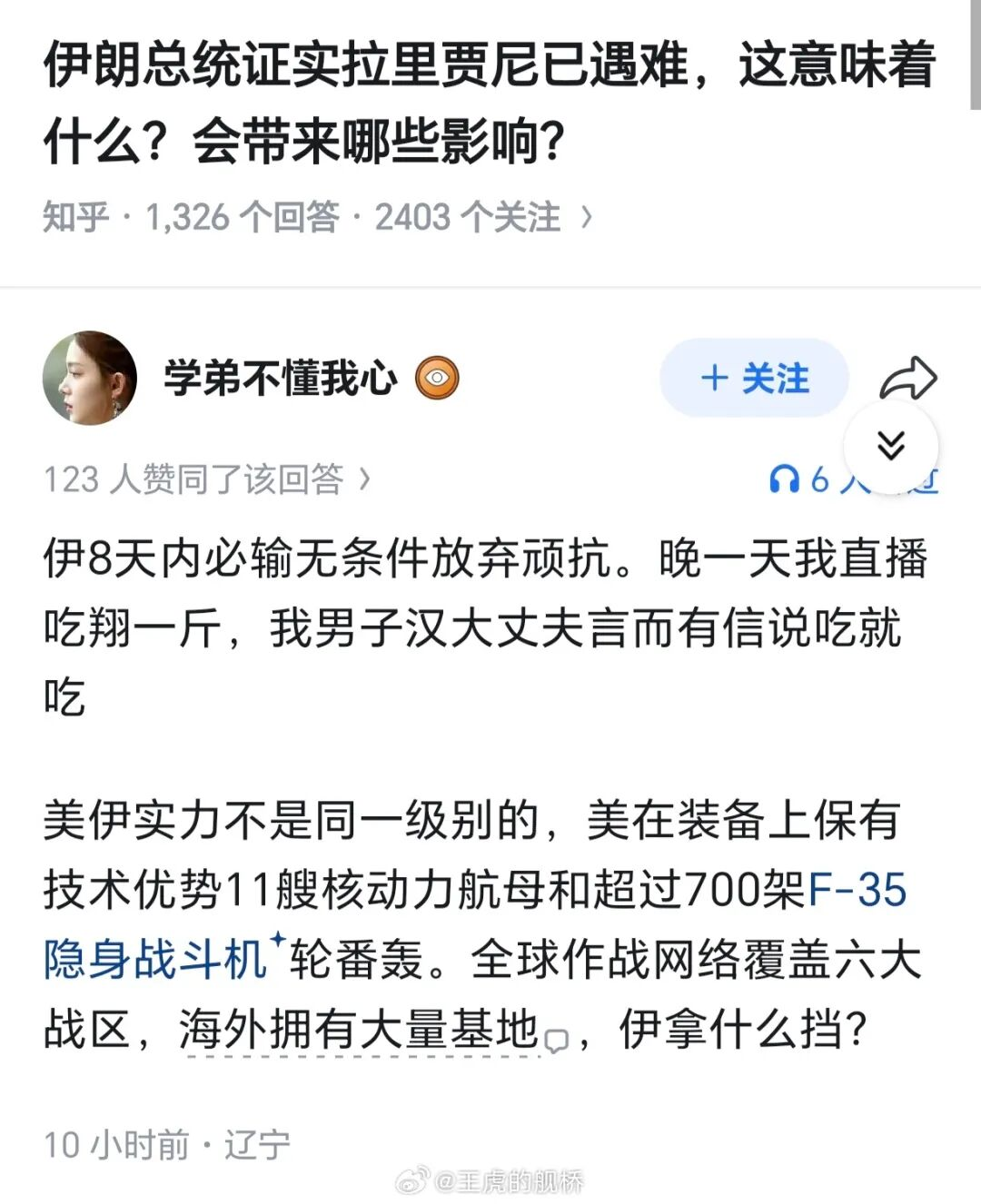 伊朗人用一个多月的坚韧验出了美国武力的真实成色,国人也应该早点结束对美军的迷信了。如果特朗普不愿意体面,那么自有人帮他体面。制造业颓败而文娱业发达的美国,努力维持着天下布武的形象,今年以来美国的两次军事行动证明,衰败的帝国还能踏倒一座本就摇摇欲坠的危房,却不能拆掉一座看似荒废却根基坚实的小屋,更不要说撞倒摩天大厦了。我们热爱和平,但有人拿着上一个时代的破铜烂铁来讹诈,就一定要让他吃到苦头。