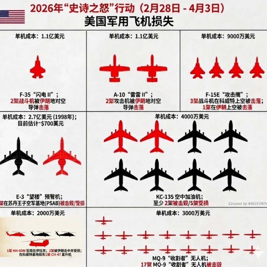 即使不计入同一时间爆出照片、证实在地面被炸毁的一架美军CH-47(位于科威特,受损时间可能为4月1日),美军在4月3日单日就损失了3架飞机、受伤2架,创下越南战争以来最高单日损失纪录,在丢脸程度上对俄罗斯空天军奋起直追。