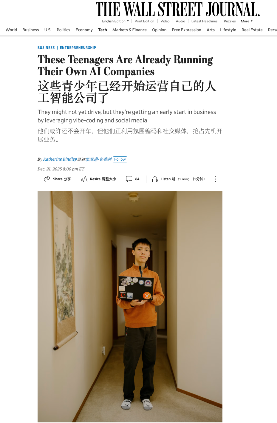 根据《华尔街日报》不久前的报道,一批15岁、16岁、17岁的青少年,已经开始独立运营自己的AI公司:他们拥有真实用户、真实产品、真实收入,甚至已经开始影响上市公司的决策。