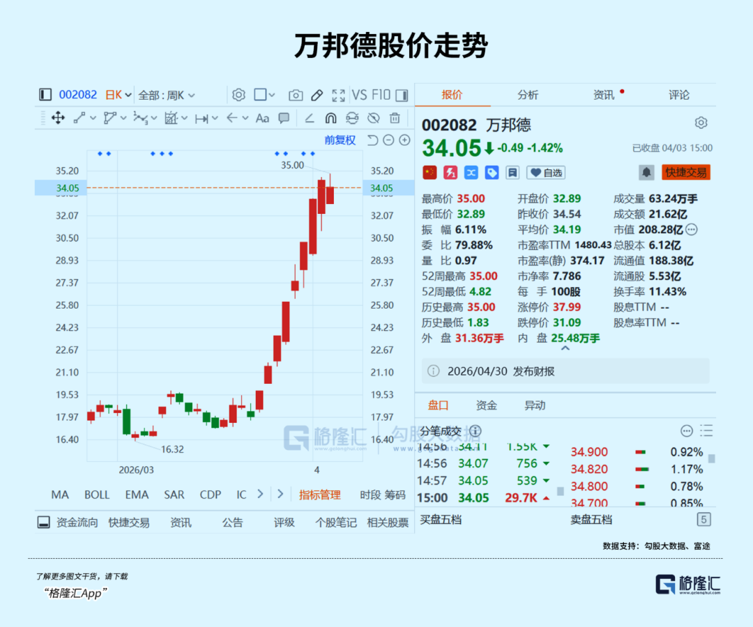 业绩的巨幅暴涨,带来了万邦德的股价起飞。
