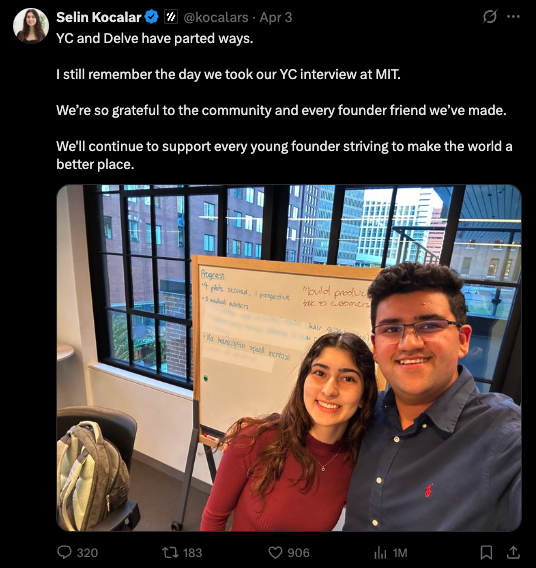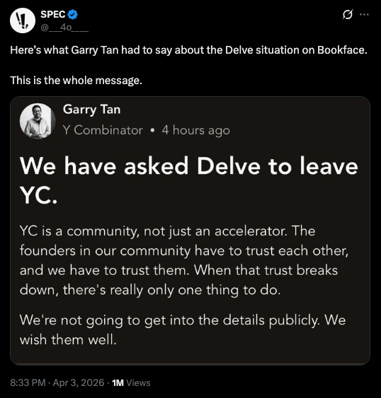 到4月初,就在Bookface上与Delve公开决裂:「We have asked Delve to leave YC」。