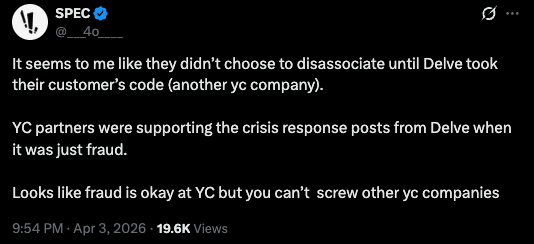 YC社区瞬间炸了。但让我没想到的是,让很多YC校友党同伐异的点:不是Delve造假,而是谁胆敢把Bookface的内容泄露出去了。