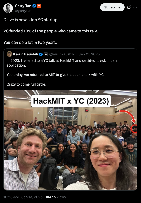 Garry Tan 2025年9月在X上公开夸Delve:「Delve is now a top YC startup.YC funded 10%of the people who came to this talk.You can do a lot in two years.」六个月后,他毫不犹豫地把Delve的名字从墙上刮掉了。