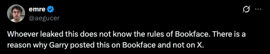 一个叫emre的YC校友发了一条高赞回复:「Whoever leaked this does not know the rules of Bookface.There is a reason why Garry posted this on Bookface and not on X.」