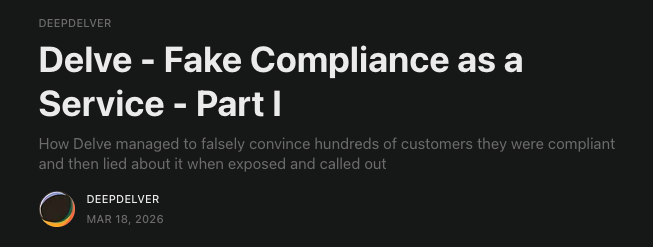 3月22日,一个叫DeepDelver的匿名Substack账号发了一篇长文:《Fake Compliance as a Service》,指控Delve系统性伪造合规报告:不是由美国CPA事务所独立审计的,而是Delve自己生成、由印度认证工厂橡皮章签发的。493份报告里,只有格式化的客户名不同,其余内容99.8%一致。