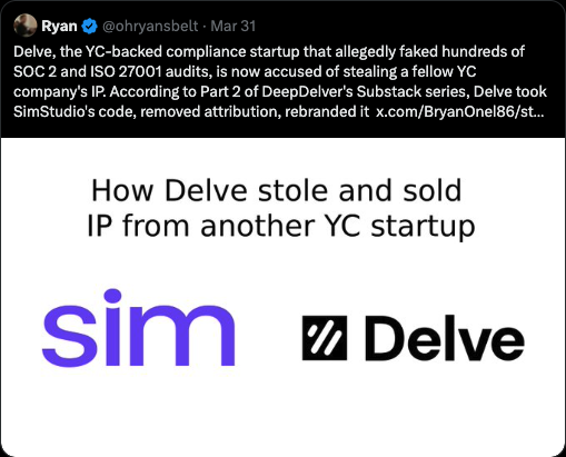 Delve的no-code工作流产品Pathways,卖给企业客户5到20万美元一套,但是,这款产品实际上是从SimStudio fork下来的。SimStudio是Sim.ai的开源产品。而且,Sim.ai也是YC公司。
