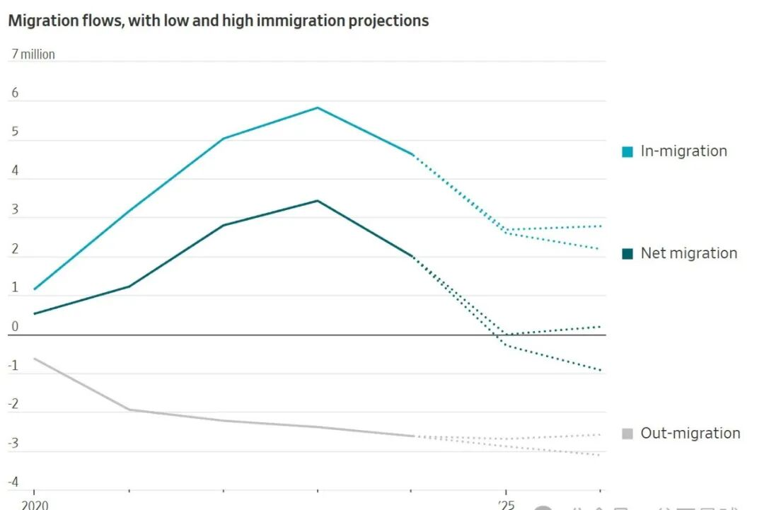 据布鲁金斯学会的计算,美国在2025年经历了净移民的负增长——预计约15万人迁出了美国——而且2026年人口外流可能会加剧。布鲁金斯学会的分析师指出,由于美国官方数据尚未完全反映人口外流的情况,实际的人口变动数据还需要核准。不过,从官方公布的数据来看,2025年美国总移民人数约为260万至270万,这远远低于2023年近600万的峰值。
