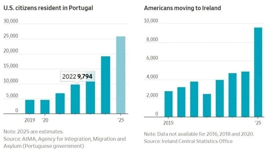 去年,移居德国的美国人比移居美国的德国人多。爱尔兰的情况也类似,预计2025年将有1万名美国人移居爱尔兰,约为2024年人数的两倍。