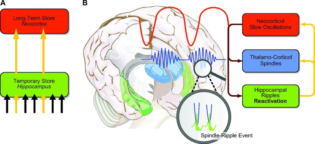 睡眠期间主动系统巩固模型。A(数据迁移):在深度睡眠(慢波睡眠)期间,刚写入“海马体”(临时存储区)的记忆会被反复回放,从而被逐步转移并固化到“新皮层”(长期存储区)中。B(传输协议): 这个数据转移过程,依赖于两个区域之间高度同步的“对话”。大脑皮层会发出缓慢的脑电波(红线)作为主控节拍。在波峰的驱动下,海马体将记忆碎片打包成高频信号(绿线处的尖波涟漪),并与丘脑发出的载波(蓝线处的纺锤波)完美配合。这就像是把高频的记忆数据,精准地镶嵌进传输通道的空隙里,确保信息被同步上传至大脑皮层。|图片来源:National Library of Medicine(United States)