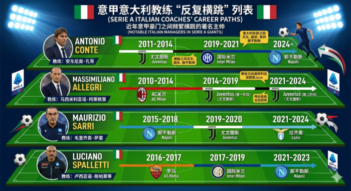 阿莱格里离开尤文,几年后又回来;孔蒂在尤文成功后去了国际米兰,又在几年后回到意大利执教那不勒斯;因扎吉从拉齐奥跳到国际米兰;皮奥利在这几家俱乐部之间反复横跳……你甚至可以画一张图,把意甲顶级主教练的履历连起来,会发现这是一个惊人的闭环。