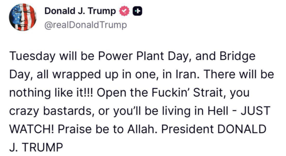 4月5日,特朗普在Truth Social上发帖,威胁伊朗将在周二对伊朗电厂和桥梁实施打击。图源:X